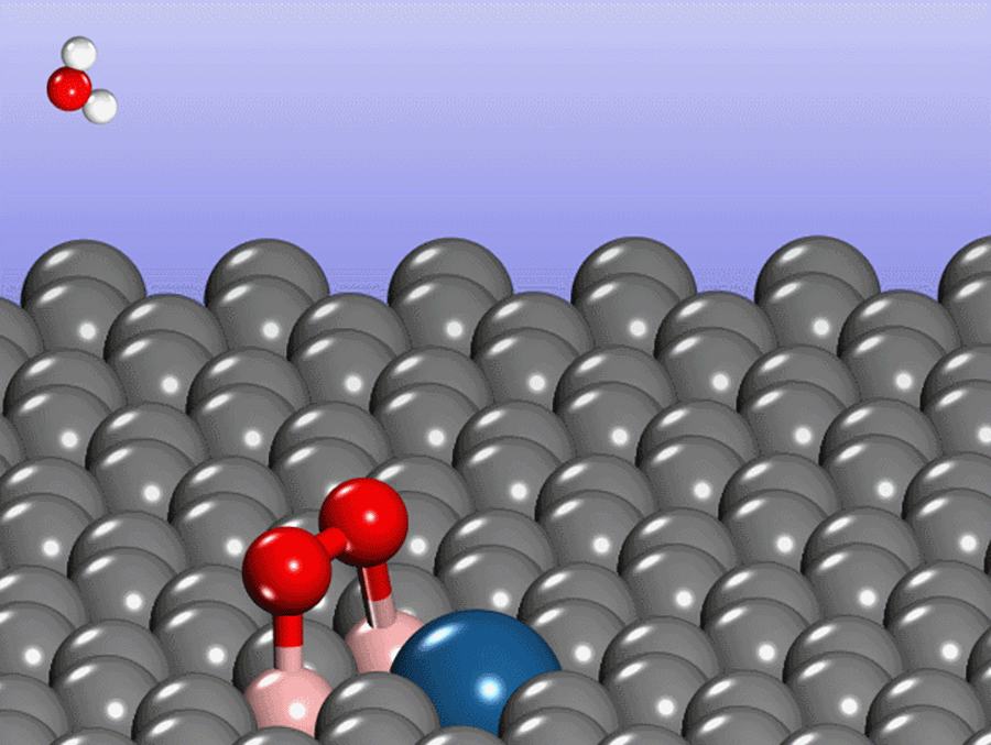 浙江工業大學王建國教授、鐘興教授團隊在國家自然科學基金杰出青年基金項目、國家自然基金委重大研發計劃集成項目、浙江省杰出青年等項目資助下,通過多尺度計算揭示臭氧與氧化鉛之間存在強相互作用,并且氧化鉛與臭氧分子形成了動態的“五元環”結構(圖1),形成相對穩定的“動態活性位”,即氧化鉛“晶格氧”和水分子中的“氧”發生交換。