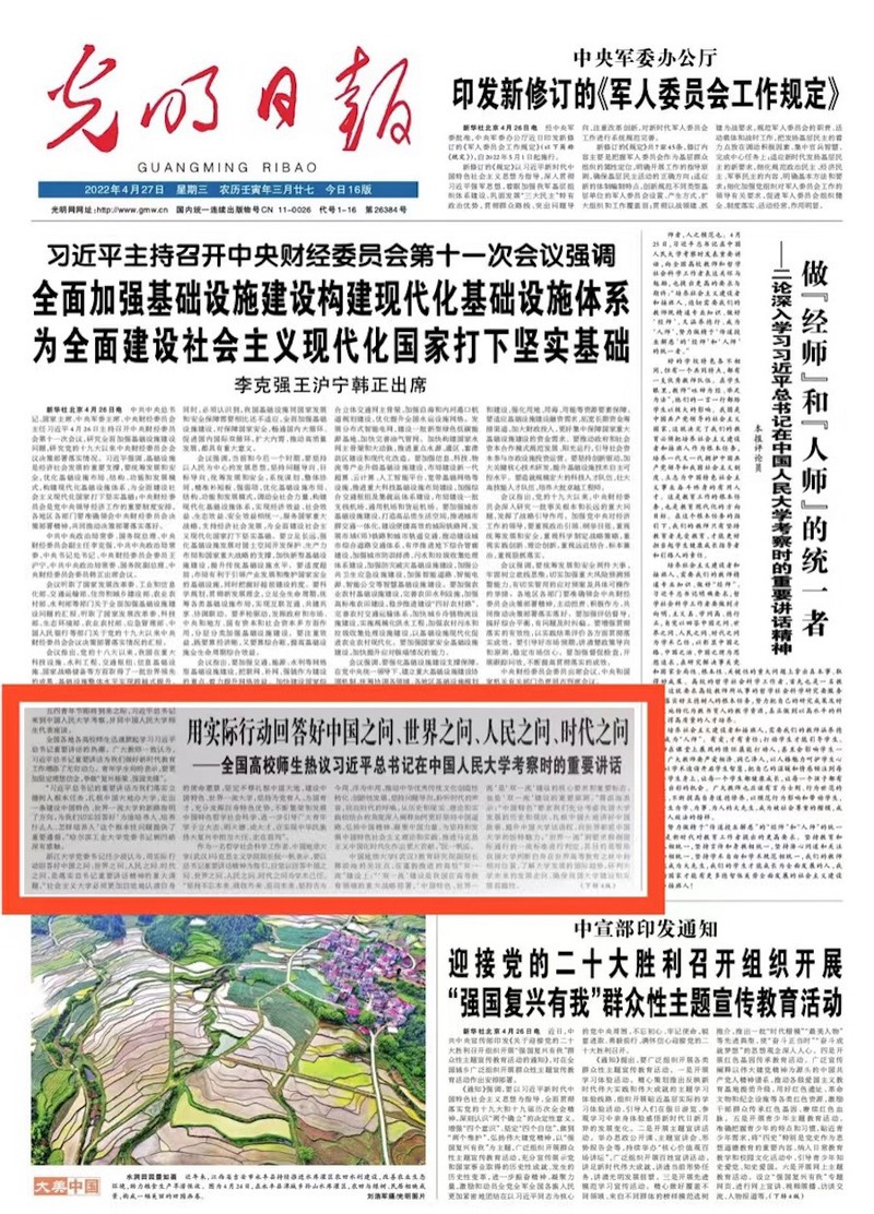 4月27日,《光明日報》頭版以《用實際行動回答好中國之問、世界之問、人民之問、時代之問——全國高校師生熱議習近平總書記在中國人民大學考察時的重要講話》為題,刊發我校城鄉規劃學2020級碩士研究生、浙江省學聯執行主席程正俊熱議:用實際行動回答好中國之問、世界之問、人民之問、時代之問。