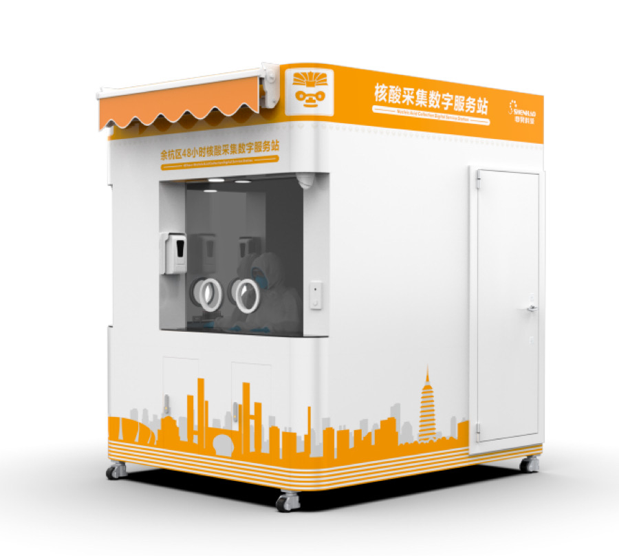 從外觀上看,這是一個橙白外立面,繪有杭州地標建筑和良渚文化元素的箱體,底部還有4個輪子,便于移動。這個封閉式空間里配備了正壓新風系統、空調、高效過濾器、氣溶膠消毒、對講裝置、LED 外部照明等裝備,工作人員在里面可坐可站,做好普通防護即可。為照顧到不同身高的被采樣人群,團隊充分優化產品的操作界面和人機尺寸,保證采樣過程的順利進行。同時,團隊還根據各種排隊檢測的復雜情形,充分模擬現場環境,構建協同合作機制,開設雙人工位,加快檢測流程。