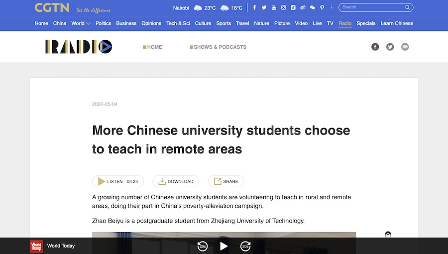 5月4日,中國(guó)國(guó)際廣播電臺(tái)的英語(yǔ)資訊廣播(CGTN Radio)新聞縱貫線(The Beijing Hour)欄目播報(bào)我校研究生支教團(tuán)成員、化學(xué)工程學(xué)院趙貝瑜的西部支教事跡。