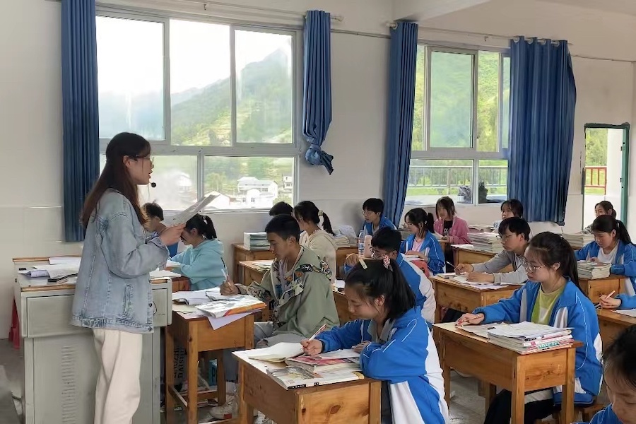 Last August, She participated in a campaign launched by her school and started teaching in a remote town in Sichuan Province. Since then she has been teaching math to a class in first grade and biology to two classes in ninth grade.