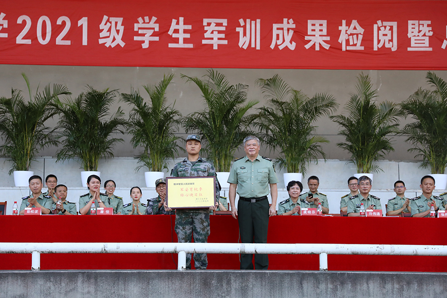 陳杰向承擔(dān)本次學(xué)生軍訓(xùn)任務(wù)的拱墅區(qū)人民武裝部贈(zèng)送紀(jì)念牌匾。駐訓(xùn)部隊(duì)首長(zhǎng)宣讀軍訓(xùn)師嘉獎(jiǎng)令。