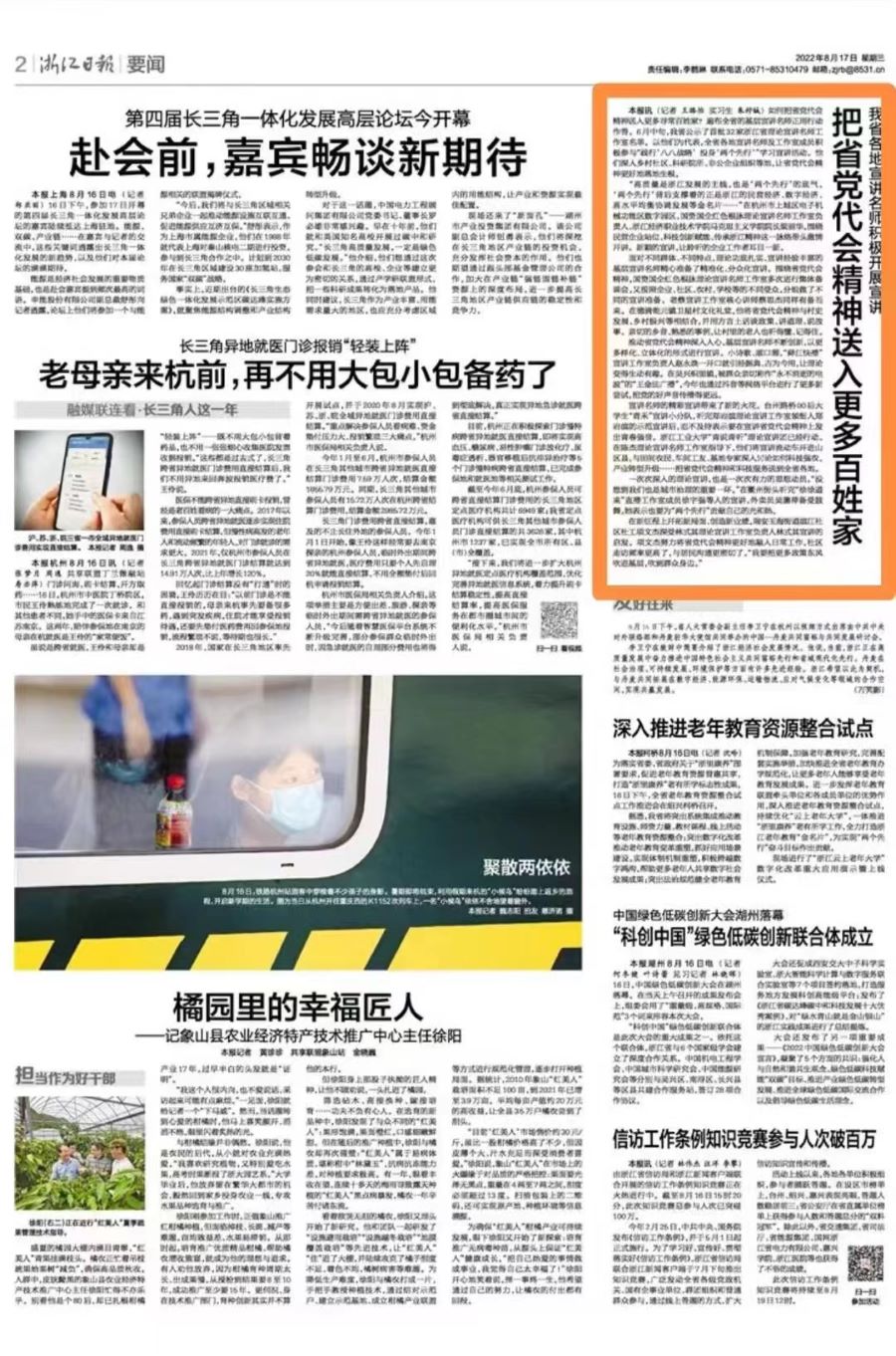 8月17日,《浙江日報》以《我省各地宣講名師積極開展宣講把省黨代會精神送入更多百姓家》為題,報道我校陳杰理論宣講名師工作室開展“青說青聽”理論宣講行動。