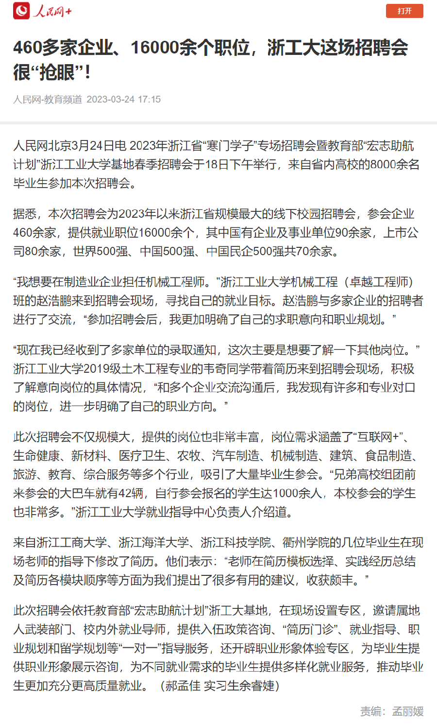 3月24日,人民網《460多家企業、16000余個職位,浙工大這場招聘會很“搶眼”!》的新聞中,再次以文字形式報道我校春節就業招聘會。