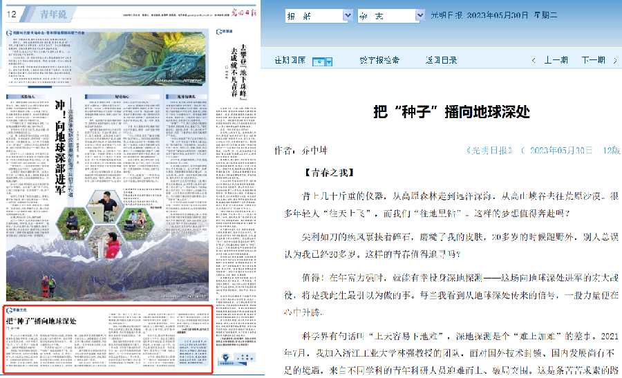 5月30日,《光明日報》第12版刊發了我校“青說青聽”青年科學家宣講團喬中坤的署名文章《把“種子”播向地球深處》。文章中,喬中坤就科研工作者的探索鉆研精神發表觀點。