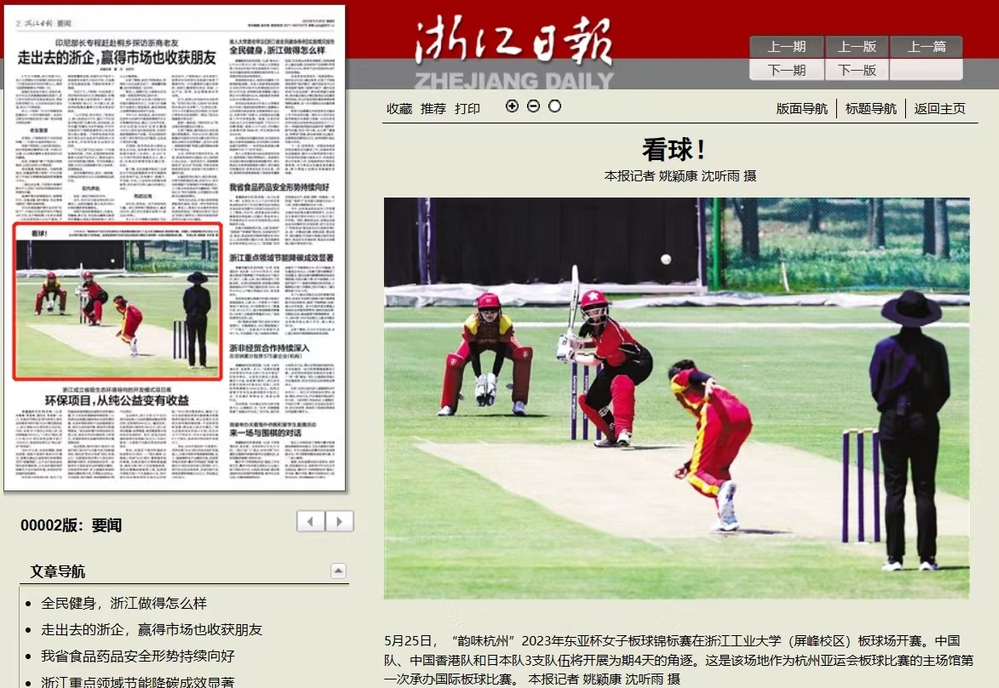 5月26日,《浙江日報》要聞版以《看球!》為題,報道了在我校舉辦的“韻味杭州”2023年東亞杯女子板球錦標賽。此外,新華社客戶端、浙江衛視等多平臺都對此次賽事進行了跟蹤報道。