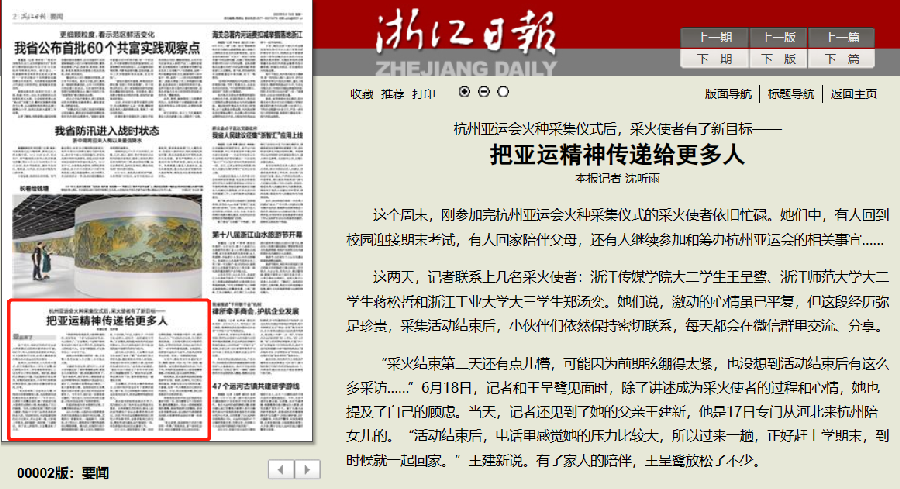 6月19日,《浙江日?qǐng)?bào)》要聞版以《杭州亞運(yùn)會(huì)火種采集儀式后,采火使者有了新目標(biāo)——把亞運(yùn)精神傳遞給更多人》為標(biāo)題,報(bào)道了我校亞運(yùn)會(huì)采火使者鄭湯奕參與采火儀式的心得和體會(huì)。