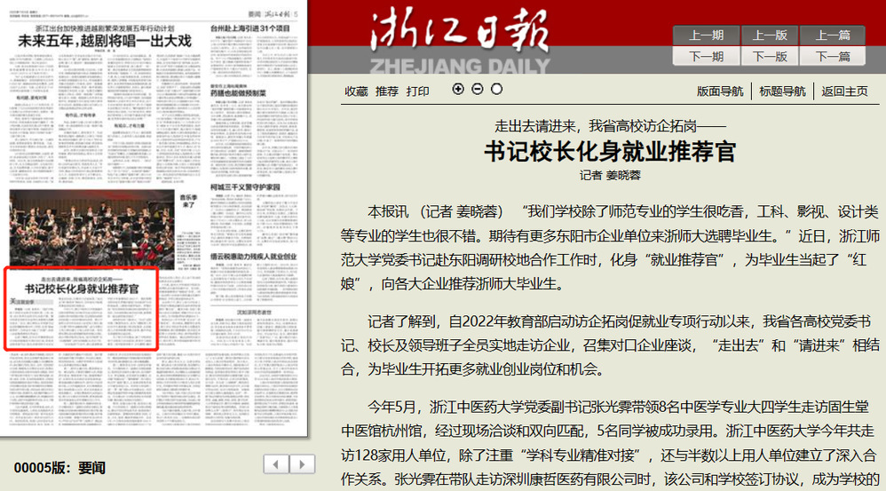 7月5日,《浙江日報》以《走出去請進(jìn)來,我省高校訪企拓崗——書記校長化身就業(yè)推薦官》為主題,報道了我校為促進(jìn)就業(yè)進(jìn)行的訪企拓崗相關(guān)工作。