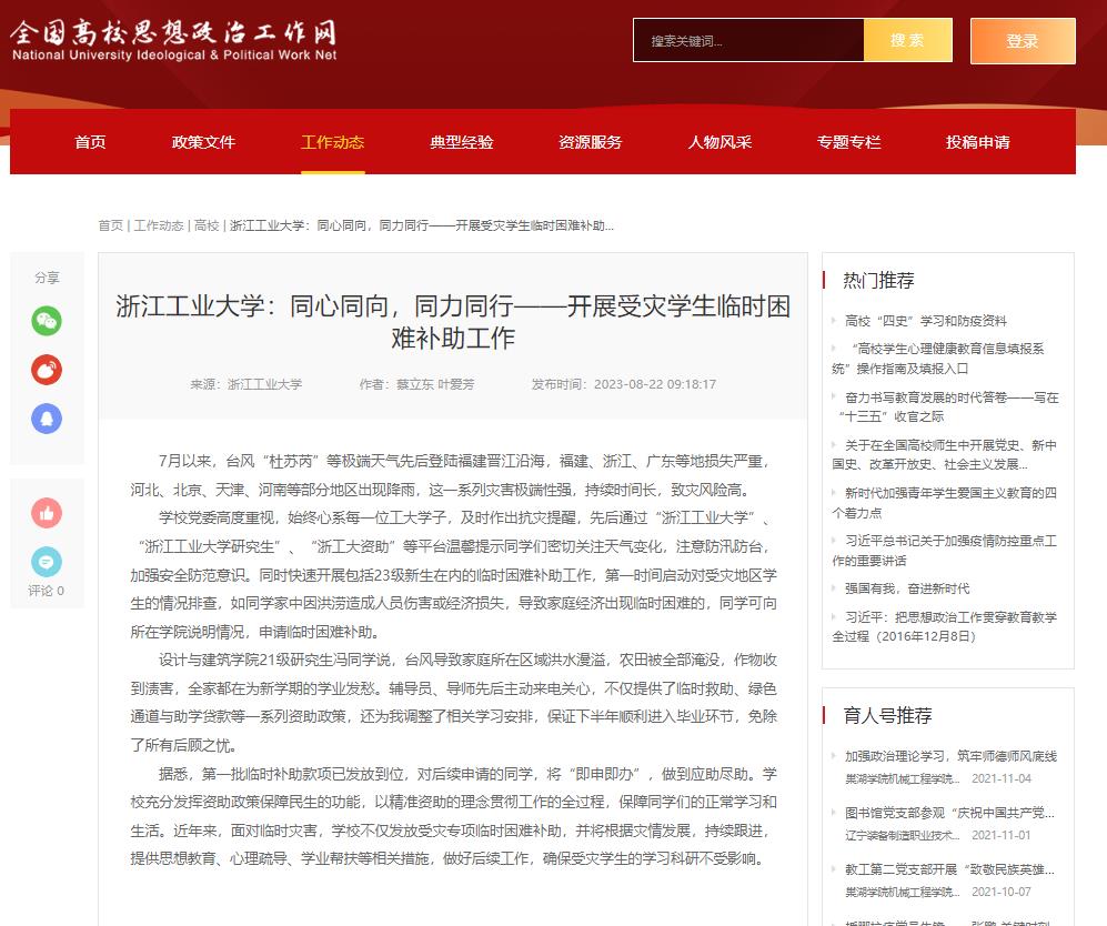 近日,全國高校思想政治工作網以《浙江工業大學:同心同向,同力同行——開展受災學生臨時困難補助工作》報道了我校對受災學生的相關幫扶舉措。受“杜蘇芮”“卡努”等強臺風影響,全國多地出現極端降雨,引發洪澇和地質災害。學校第一時間啟動響應,通過多平臺發布信息,提醒防汛防臺,同時快速開展包括23級新生在內的臨時困難補助工作,做到“應助盡助”。