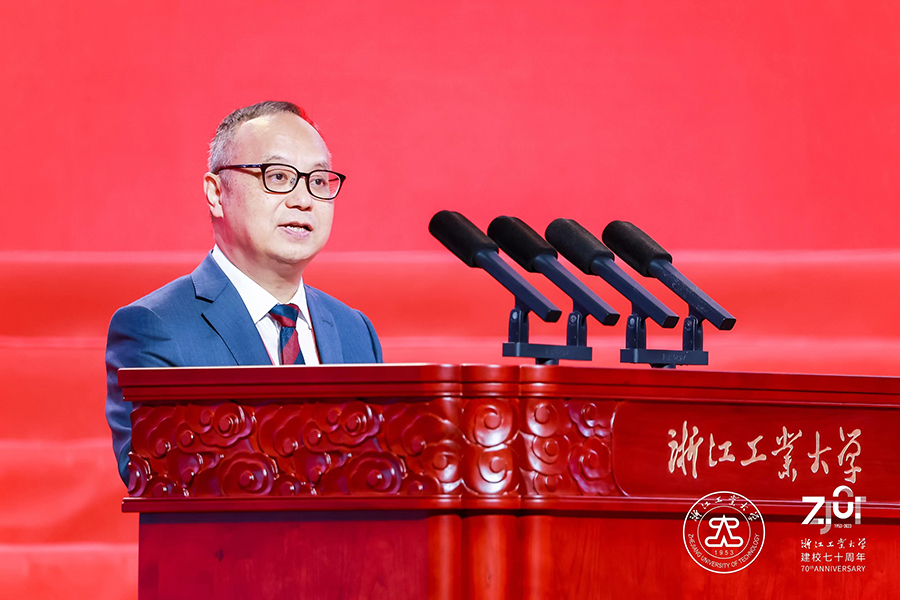 兄弟高校代表,浙江大學校長、中國科學院院士杜江峰表示,浙江工業大學始建于1953年,誕生在如火如荼的社會主義建設熱潮之中,發展于波瀾壯闊的改革開放和民族偉大復興之時,是我國東部沿海地區第一所省部共建高校、首批國家級“2011協同創新中心”牽頭高校和浙江省首批重點建設高校。浙工大與浙大比鄰而居、淵源深厚,兩校具有相契合的發展基因和文化底蘊,在化工、材料、能源、生物等很多領域合作成果豐碩,在人才培養、科學研究等方面攜手共進,形成了多層面、深層次的交流合作格局。他祝愿浙工大越辦越好,在建設高水平研究型大學的新征程上取得更大成就,在服務支撐浙江省“兩個先行”和“重要窗口”建設中展現更大作為,在服務高等教育強國建設、實現中華民族偉大復興、推動構建人類命運共同體的進程中鑄就新的輝煌!