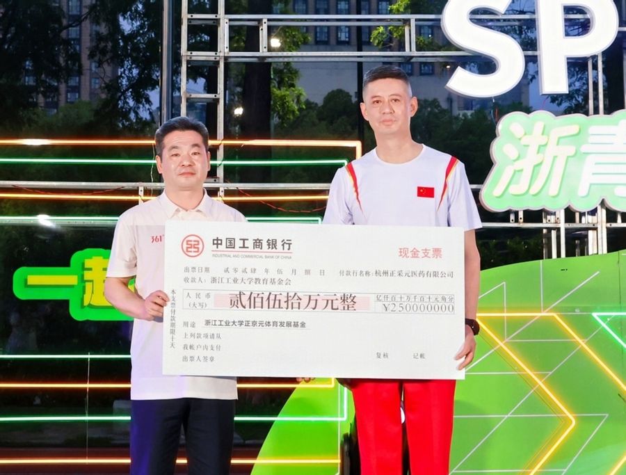 正京元向學校捐贈支票設立“浙江工業大學正京元體育發展基金”