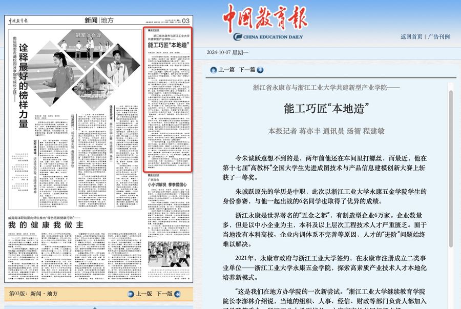 10月7日,《中國(guó)教育報(bào)》第3版以《浙江省永康市與浙江工業(yè)大學(xué)共建新型產(chǎn)業(yè)學(xué)院——能工巧匠“本地造”》為題,報(bào)道我校永康五金學(xué)院辦學(xué)新模式。浙江工業(yè)大學(xué)永康五金學(xué)院由永康市政府與我校合作共建,是政產(chǎn)校協(xié)同為地方“本地化”培養(yǎng)產(chǎn)業(yè)人才的創(chuàng)新實(shí)踐。學(xué)院自2021年9月成立以來(lái),創(chuàng)新辦學(xué)體制,成立永康五金學(xué)院管委會(huì),建立產(chǎn)教合作聯(lián)盟,服務(wù)永康產(chǎn)業(yè)發(fā)展;創(chuàng)新教學(xué)體系建設(shè),發(fā)揮好學(xué)校辦學(xué)優(yōu)勢(shì)的同時(shí),注重產(chǎn)業(yè)師資和學(xué)院專職實(shí)戰(zhàn)型教師隊(duì)伍構(gòu)建,研發(fā)本地化課程體系。學(xué)院根據(jù)產(chǎn)業(yè)發(fā)展實(shí)際需求,開設(shè)“浙工大頭雁班”、成立研究生培養(yǎng)基地,開展“東遷西歸”項(xiàng)目,為永康培養(yǎng)、引育中高級(jí)專業(yè)適用人才;舉辦工業(yè)設(shè)計(jì)、智能制造、新材料等產(chǎn)業(yè)急需的各類培訓(xùn)班,提升永康企業(yè)技術(shù)骨干的專業(yè)能力水平;組織“惠風(fēng)麗州”“臻善計(jì)劃”“麗州工程師計(jì)劃”等活動(dòng),賦能當(dāng)?shù)禺a(chǎn)業(yè)轉(zhuǎn)型升級(jí)。學(xué)院通過(guò)實(shí)現(xiàn)能工巧匠“本地造”,助力地方產(chǎn)業(yè)高質(zhì)量發(fā)展。